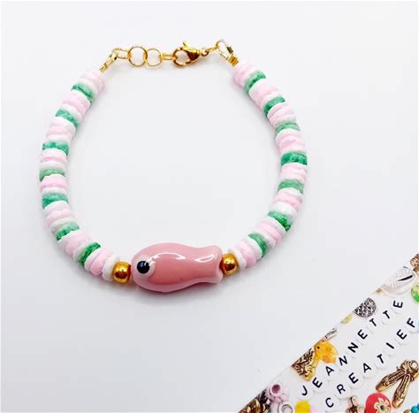 Jeannette-Creatief - Beach - Armband Pink Fish & Heishi Shell Pink, White & Green RVS Gold - Armband - Armband Met Schelpen - Keramiek - Nautische...